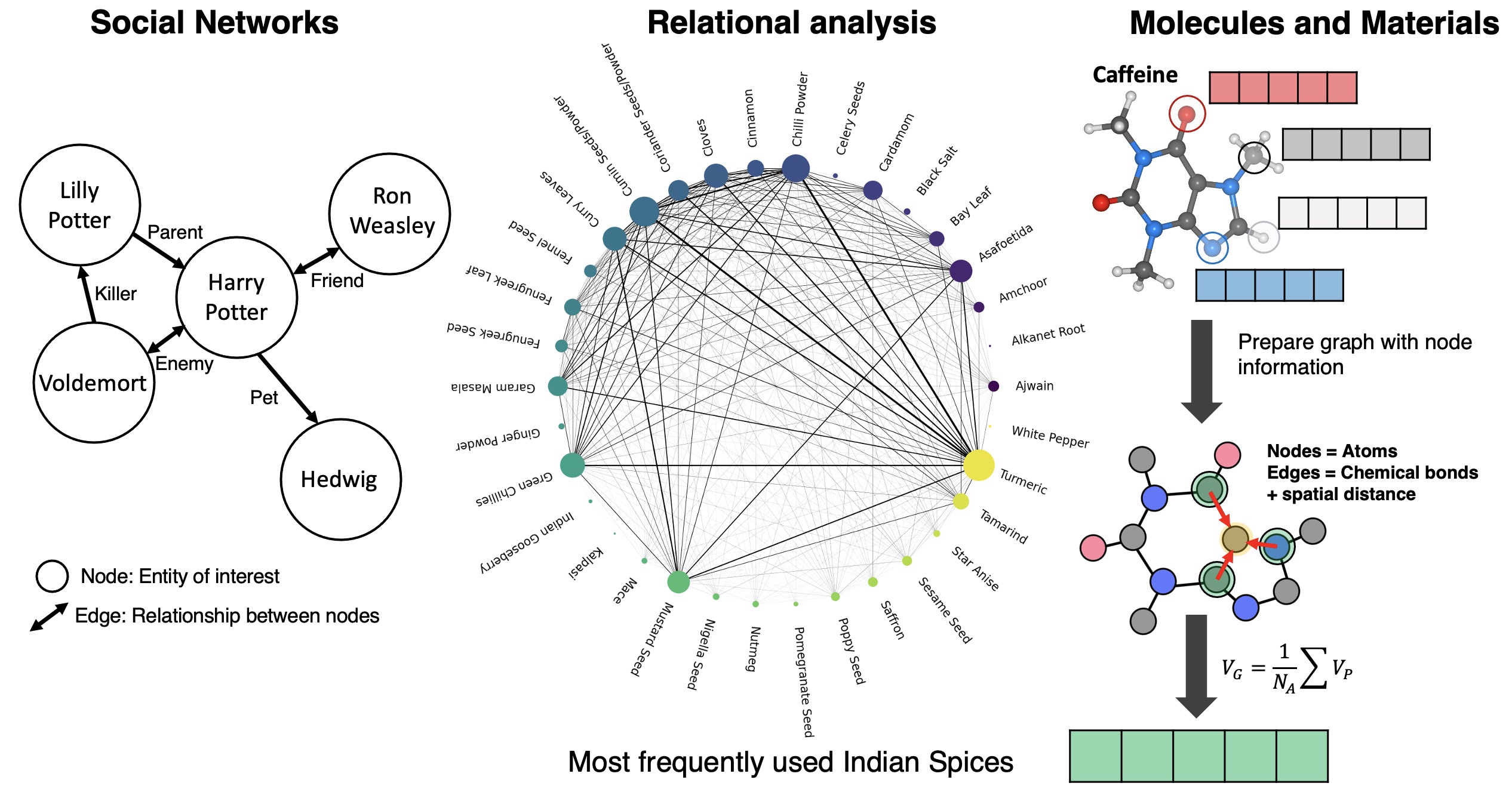 One way of addressing this challenge is to use graph-networks for presenting the atoms and their bonding environment. This idea has been implemented in understanding social interactions, relationship between entities as seen in Indian spice usage, and in modeling, predicting molecular properties of small molecules which intuitively are condusive to such graphical network representation.