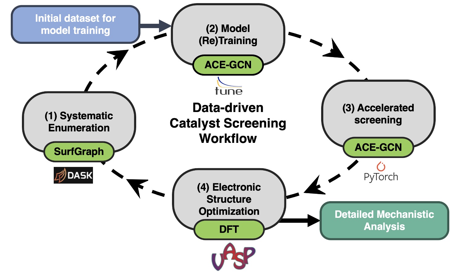 ACE-GCN leverages the expressive power of graph networks to encode and learn the mapping of electronic and geometrics features of the catalyst surface to its thermodynamic stability. Once trained, the model can be used to rank new surface representations and quickly select stable candidates.